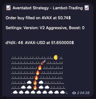 Start by setting up your strategy, then click on the three-dot menu and finally click on "Add alert on Aventabot Strategy - Lambot-Trading"