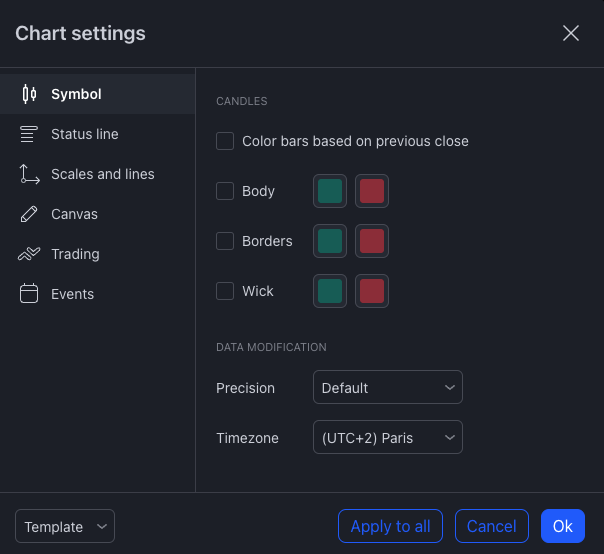 In the first tab you can deactivate the bodies, contours and wicks of the candles.